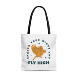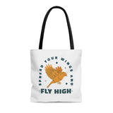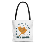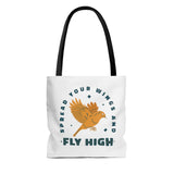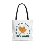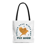 Great tote bag design of a badge with a bird, and the quote "Spread your wings and fly high".
