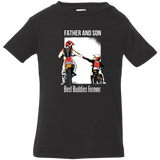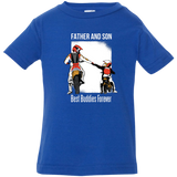 T-shirt design featuring a father and a son riding on motorcycles fist bumping with the quote FATHER AND SON BEST BUDDIES FOREVER.