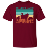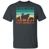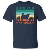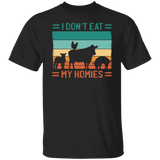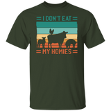 Check this great vegan t-shirt design including different farm animals silhouettes and the quote 'I don't eat my homies'.
