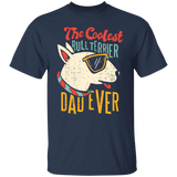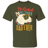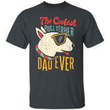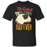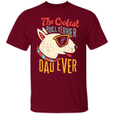 Cool t-shirt design featuring a Bull Terrier wearing sunglasses with the quote "Bull Terrier Dad Ever"