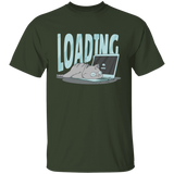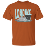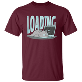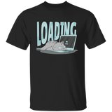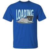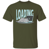 Cute cat t-shirt design of a kitty sleeping over a laptop's keyboard and the word "Loading".