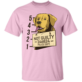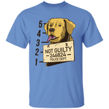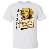 Funny t-shirt design of a labrador's mugshot, with a sign around its neck that says "Not guilty".
