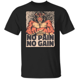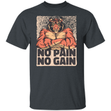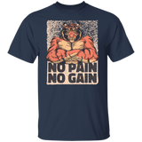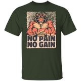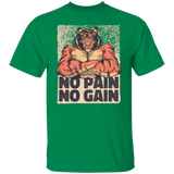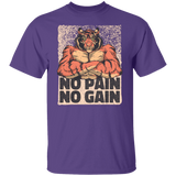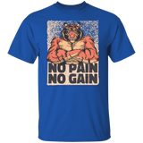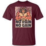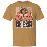 Great t-shirt design featuring a tiger with muscles over the quote "No pain, no gain".