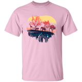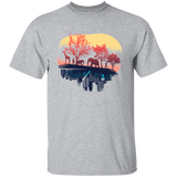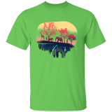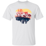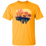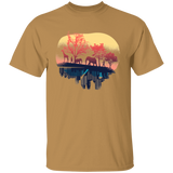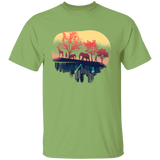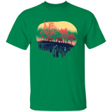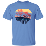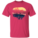Beautiful t-shirt design featuring nature savanna landscape with trees and animals with a reflection of big city buildings cityscape.