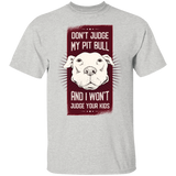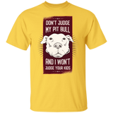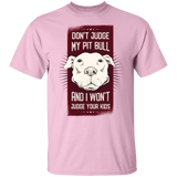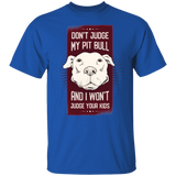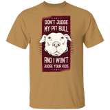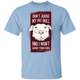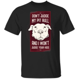 Don't Judge My Pit Bull And I Won't Judge Your Kids Funny Quote Dog T-shirt Design showing a Pit Bull Terrier's head and the quote DON'T JUDGE MY PIT BULL AND I WON'T JUDGE YOUR KIDS.