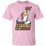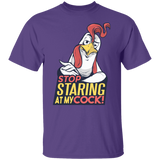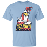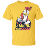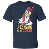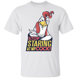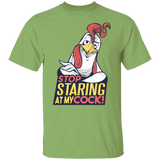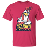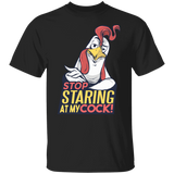 Stop Staring T-Shirt Design featuring a funny take on the phrase: Stop staring at my cock! with a cool rooster!