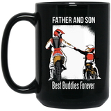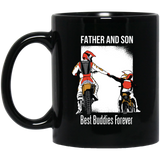 Black Mugs design featuring a father and a son riding on motorcycles fist bumping with the quote FATHER AND SON BEST BUDDIES FOREVER.
