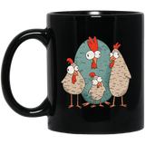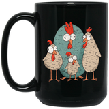 Funny Mugs Design That features an illustration of a family of chicken with crazy eyes.