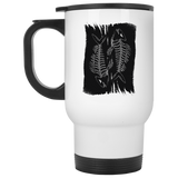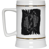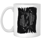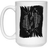 Cool Halloween theme Coffee Mugs design featuring dark evil looking fish skeleton with sharp teeth outline in grunge style.