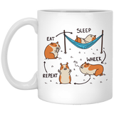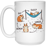 Amazing Mugs Design featuring the cycle of a guinea pig doing different activities, such as eating, sleeping and wheeking.